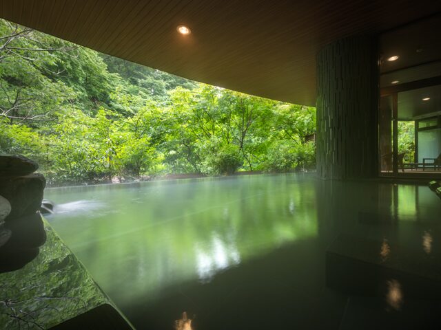 渓谷を見下ろしながら浸かる湯は格別で、夜には幻想的にライトアップされた景色を楽しむことができます。内湯もスタイリッシュなデザインで、清潔感を重視する方に非常に人気があります。