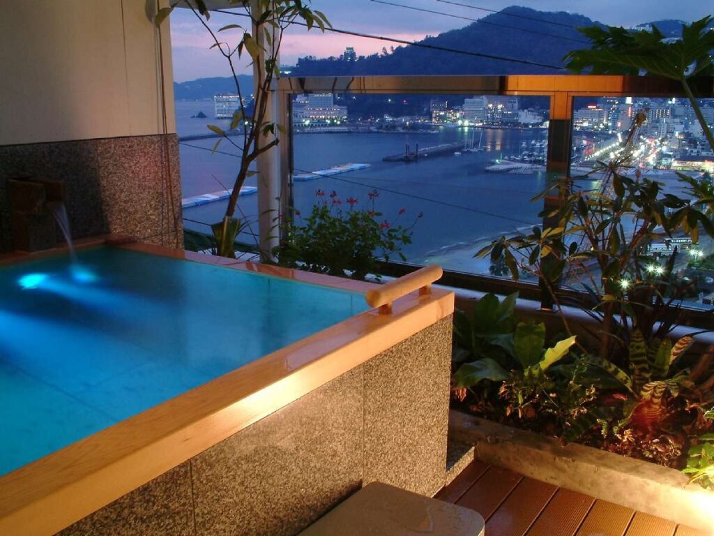 - 視界いっぱいに広がる海:高台の縁に建っているため、客室の窓からは熱海港や初島まで見渡せます。
