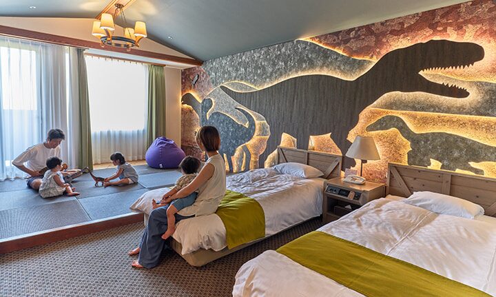 恐竜ラボルーム和洋室: 部屋全体が恐竜の研究室や探検基地のような内装になっており、恐竜のオブジェや化石のレプリカ、図鑑などが置かれています。博物館での興奮がそのまま客室に持ち込めるようなデザインで、子どもたちにとって忘れられない体験となります。