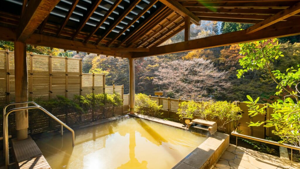 福一の露天風呂付き客室を希望する場合、選択肢はほぼ万葉館に絞られます。これらの客室では、テラスに設けられた浴槽に伊香保の名湯が満たされ、24時間いつでも好きな時に湯浴みが楽しめます。周囲の視線を気にせず、山々の稜線を眺めながら過ごす時間は、まさに至福のひとときです。