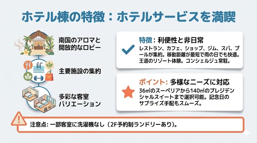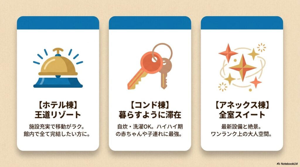 - ホテル棟を選ぶべき人: 1〜2泊の短期滞在で、レストランやプールなどの館内施設を効率よくフル活用したい方。