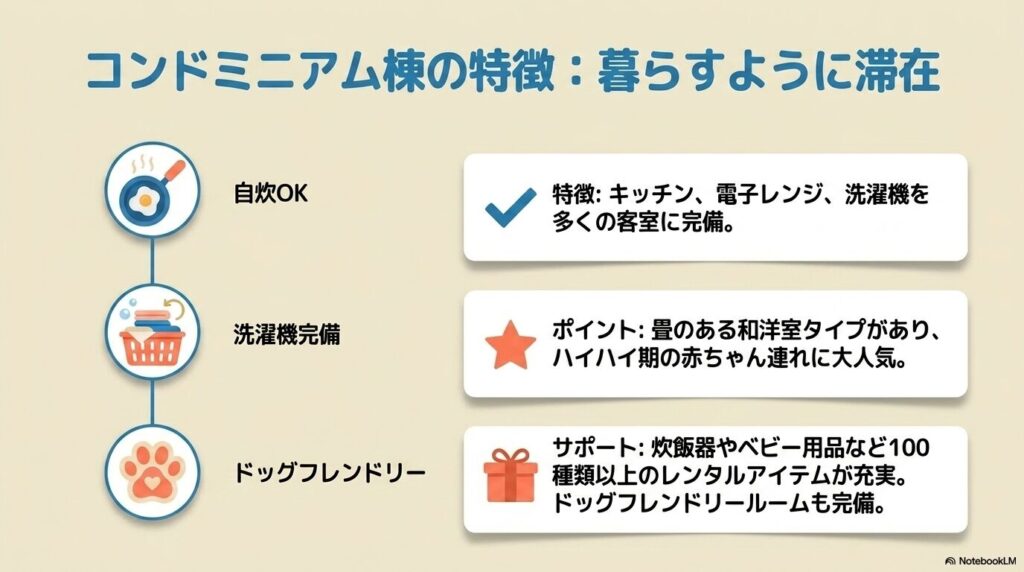 - コンドミニアム棟を選ぶべき人: 地元の食材で自炊を楽しみたい方、または愛犬と一緒に宿泊したい方(ドッグフレンドリールーム完備)。
