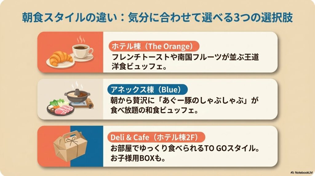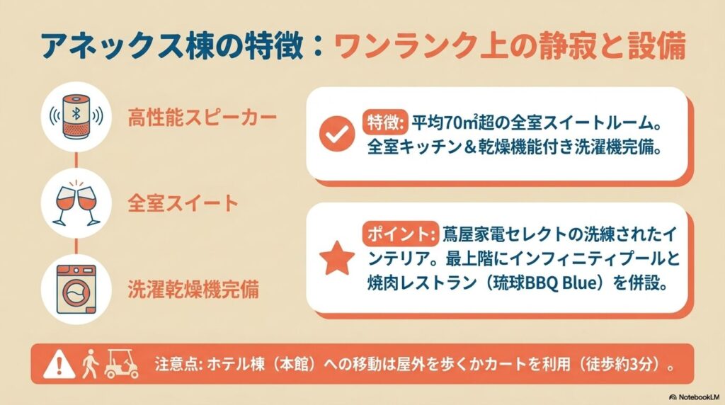 - アネックス棟を選ぶべき人: 最上階にあるインフィニティプールからの絶景や、名物のアグー豚しゃぶしゃぶ朝食を最優先に楽しみたい方。