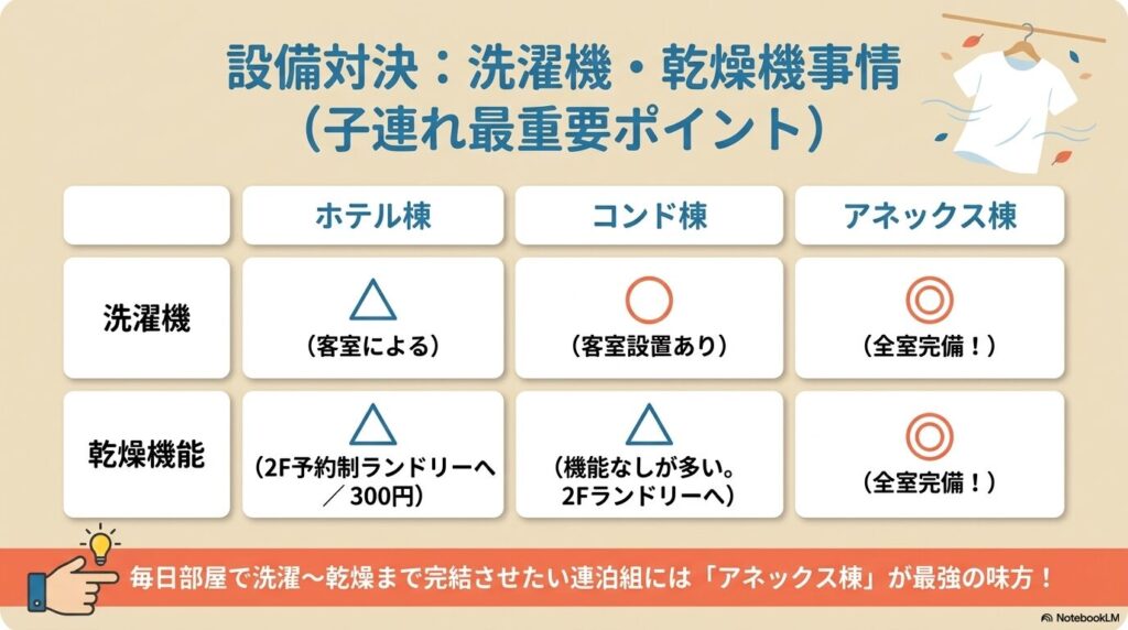 他棟との使い勝手の比較としては、ホテル棟は「館内施設へのアクセス」を最優先にする方に最適ですが、前述の通り洗濯機が室内にない客室が多く、その場合は2階のコインランドリー(1時間300円・予約制)を利用する必要がある点だけ留意が必要です。