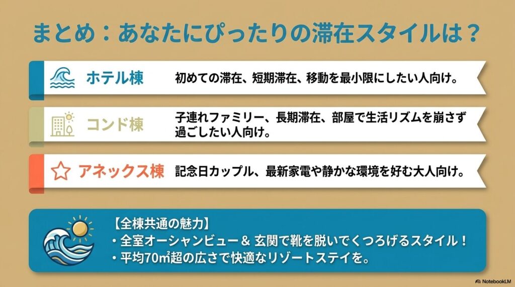 本記事では、カフーリゾートフチャクコンドホテルの棟の違いについて、様々な角度から詳しく比較・解説してきました。最後に、それぞれの棟がどのような方におすすめなのか、記事の総括としてまとめます。