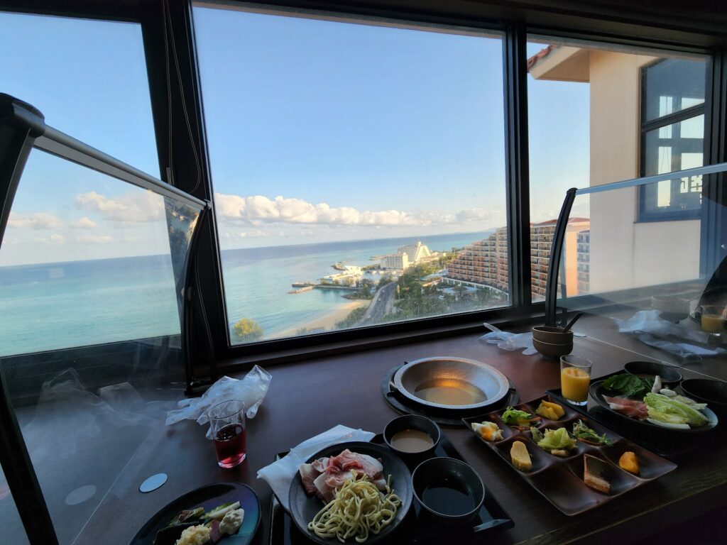 この会場のメリットは食事だけではありません。最上階の12階から見下ろすオーシャンビューはまさに絶景です。また、ホテル棟の洋食会場と比較すると比較的空いていることが多く、静かで落ち着いた雰囲気の中で、素晴らしい景色と食事をゆっくりと楽しみたい方に強く推奨されます。