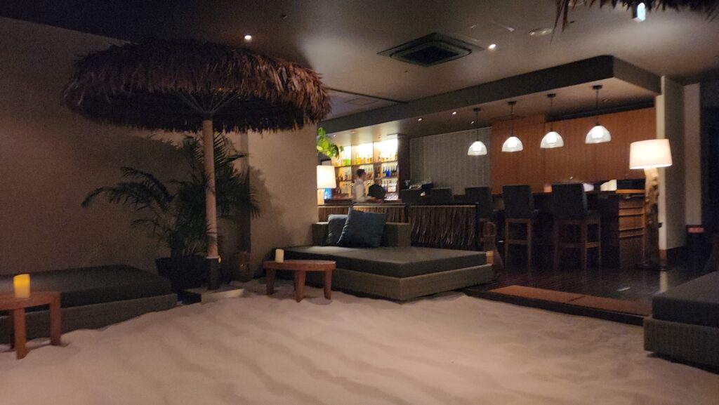 ホテル棟2階の「Deli & Cafe Bar」のエリア内には、特別な砂遊びコーナーが設けられています。サラサラのホワイトサンドが敷き詰められており、安全な環境で子供を砂遊びさせながら、大人はすぐそばのテーブルで優雅にお茶やカクテルを楽しむことができる、家族連れに優しい工夫が凝らされた空間です。
