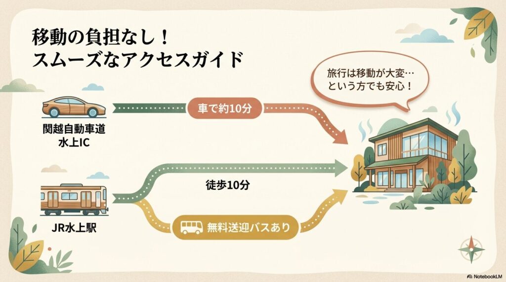 公共交通機関を利用する場合でも、JR水上駅から徒歩10分と、とても行きやすい場所にあります。さらに、無料送迎バスもありますのでアクセスの心配はありません!