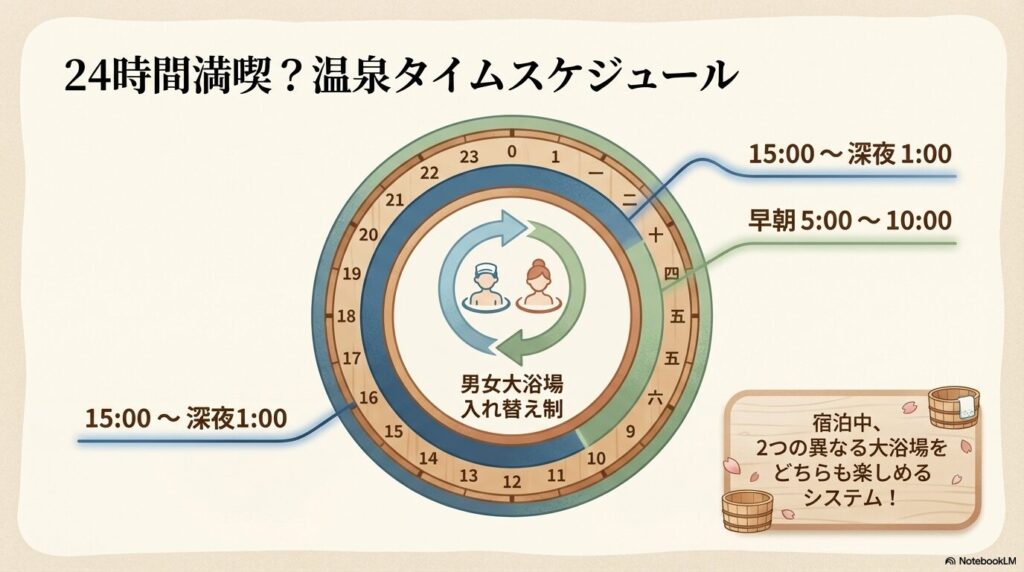 入浴時間 ・15:00〜深夜1:00・早朝5:00〜10:00(男性・女性大浴場入れ替え)