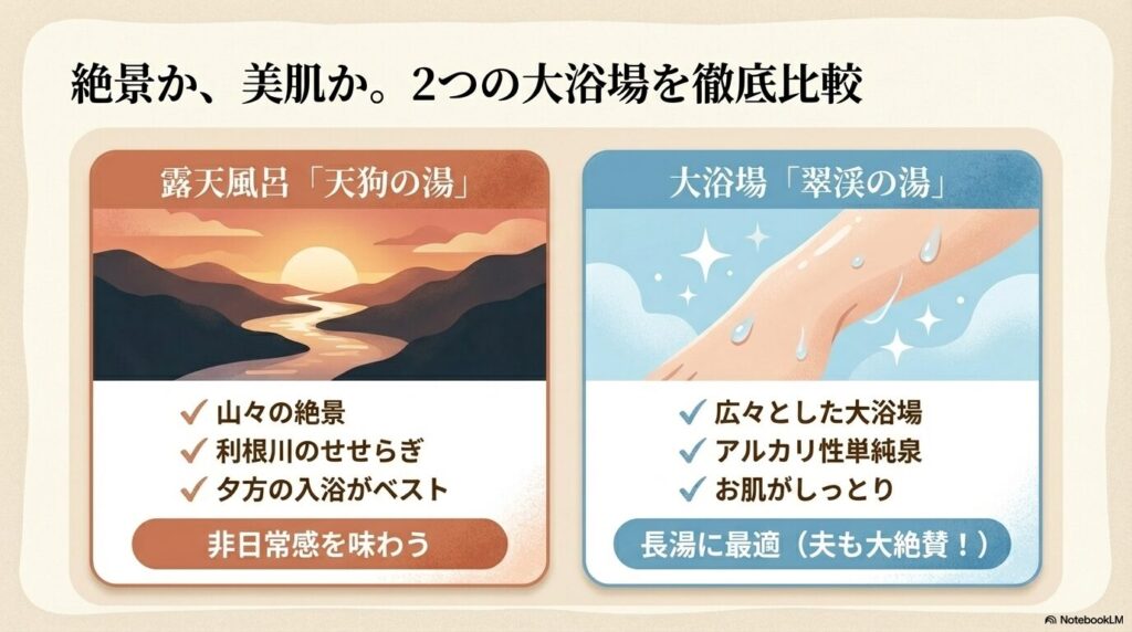 露天風呂では、周辺の山々の絶景や利根川の流れを一望できちゃいます。