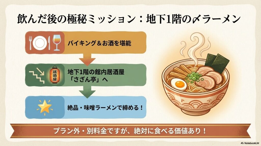沢山飲んで食べた後は館内居酒屋「さざん亭」で締めのラーメンを!