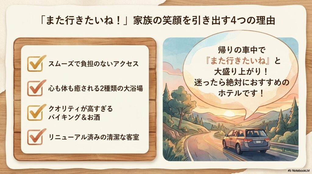 我が家も家族全員でリフレッシュできて、帰りの車中では「また行きたいね」と話が盛り上がりました。