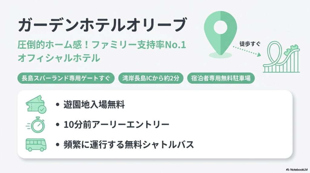 | 長島スパーランドから | 徒歩または専用シャトルバスですぐ(ホテル専用ゲートあり) |
