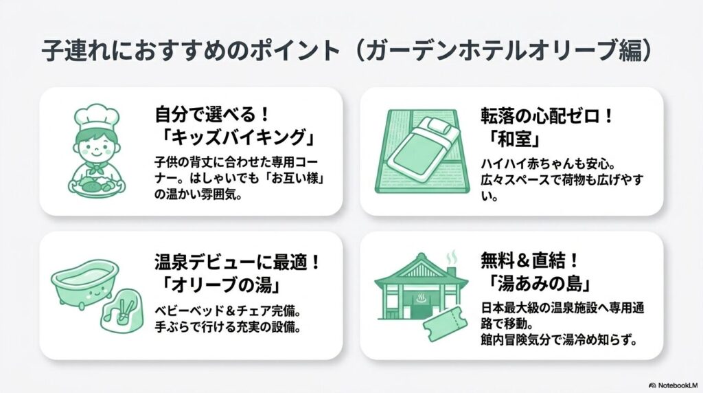 - 大浴場「オリーブの湯」は子連れ温泉デビューに最適