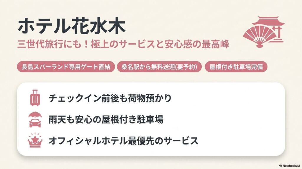 長島スパーランド周辺には多くのホテルがありますが、「子供が退屈しない工夫(キッズスペースなど)があるか」「食事のスタイルは家族のペースに合っているか」「オムツなどの消耗品サポートはあるか」という視点で選ぶと、満足度が大きく変わります。