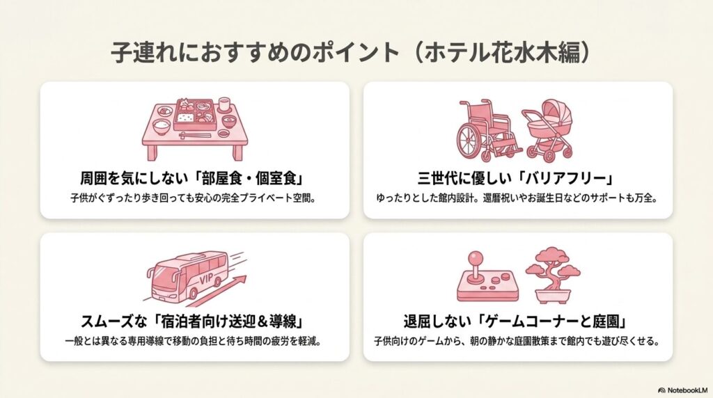 | ホテル花水木 | 質とリラックス重視 | ・部屋食・個室食で周囲を気にせず食事ができる ・三世代旅行や記念日旅行に最適 ・ワンランク上のサービスを受けたい家族に |