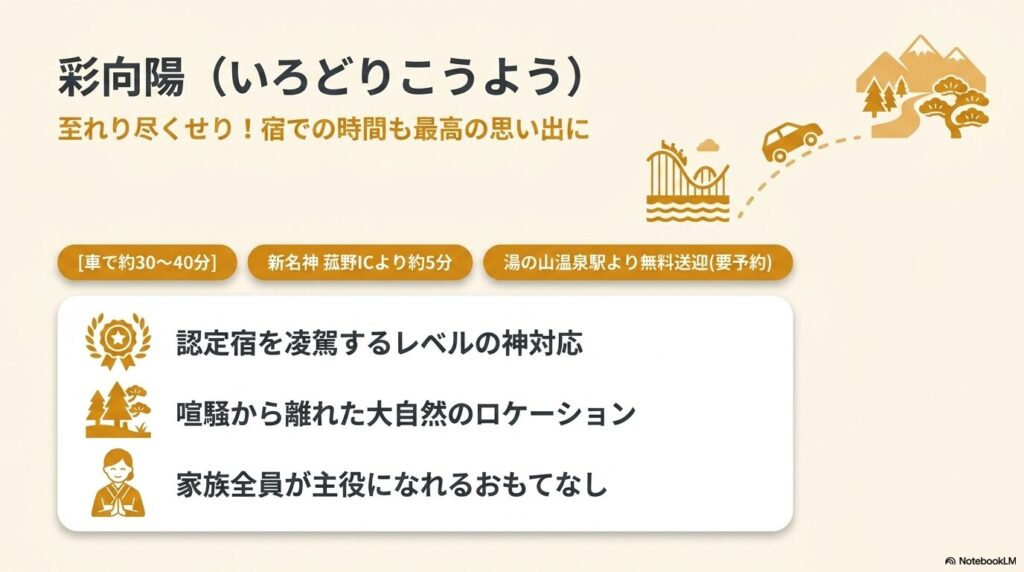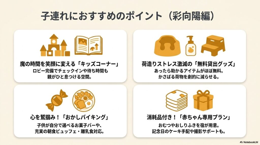 | 彩向陽(いろどりこうよう) | 宿での遊び・設備重視 | ・キッズスペースやお菓子バイキングあり ・ウェルカムベビー級の貸出グッズが豊富 ・荷物を極限まで減らしたい家族へ |
