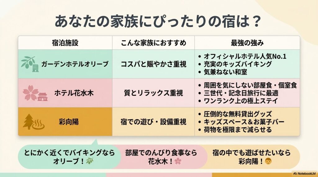 なるほど!「とにかく近くでバイキング」ならオリーブ、「部屋でのんびり食事」なら花水木、「宿の中でも遊ばせたい」なら彩向陽ってことね!