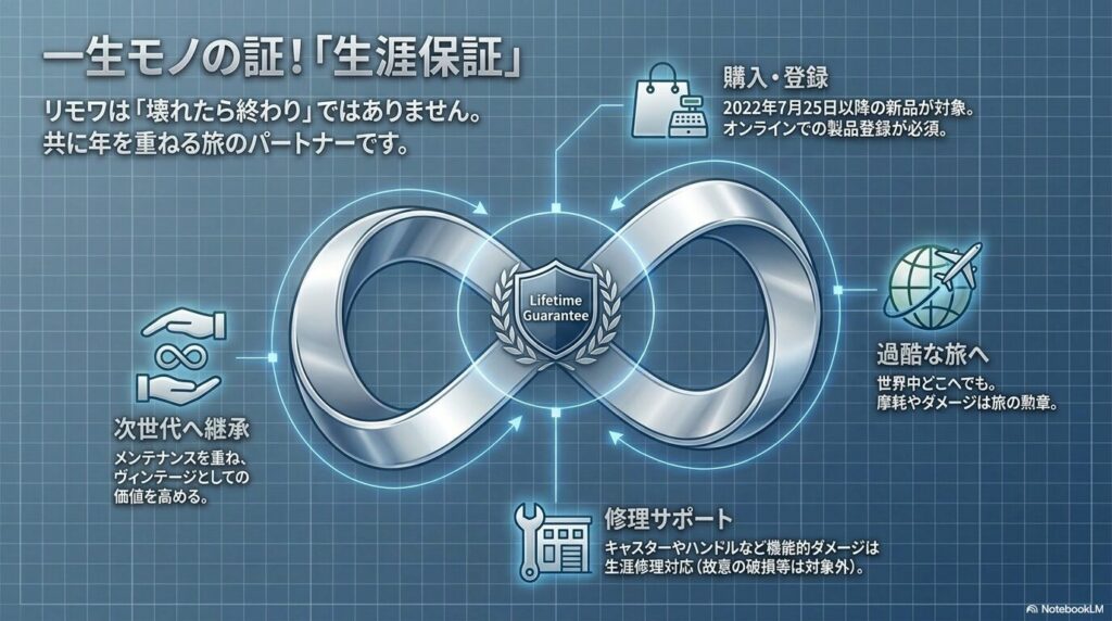 高額なスーツケースを購入する際、最も気になるのは壊れたときのサポート体制ではないでしょうか。リモワのスーツケースは高すぎるという声に対する明確な回答の一つが、業界でも異例の手厚い保証制度です。