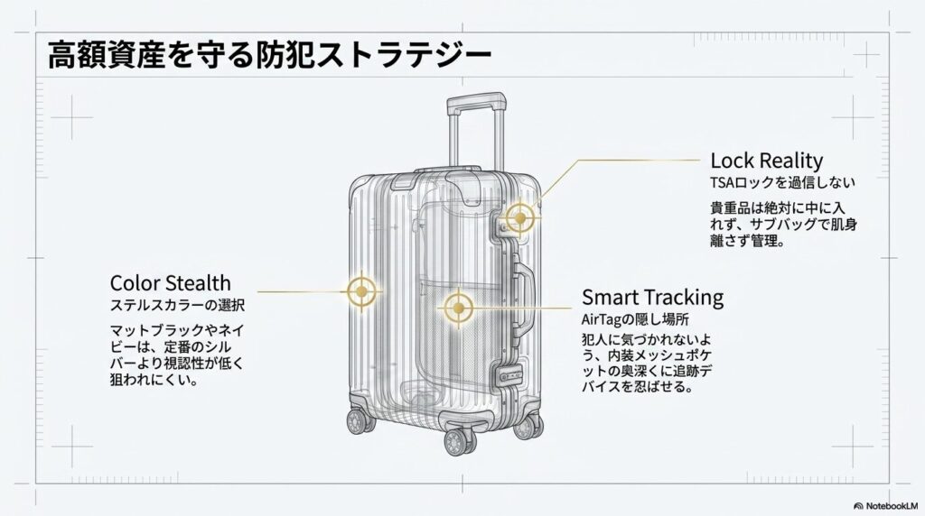 海外へ持ち出す際は、具体的な防犯やリスク管理が必須となります。定番のシルバーアルミニウムは遠目からでも非常に目立つため、防犯を最優先するならば、周囲に溶け込みやすいマットブラックやダークネイビーなどの視認性の低い色を選ぶことが有効な自衛策です。