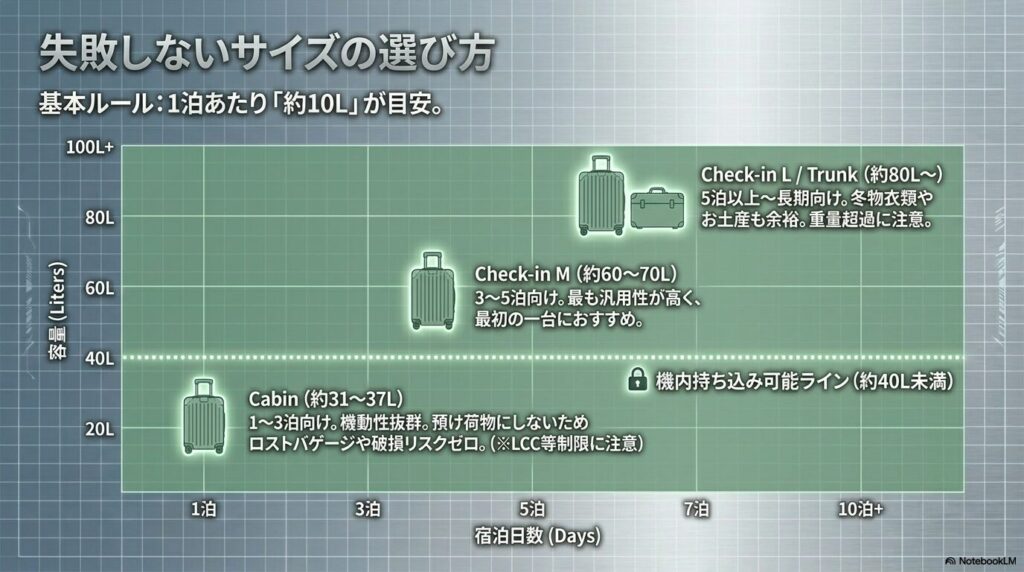 1〜3泊程度の短期旅行や国内出張に最適なキャビンサイズ(容量約31L〜37L)は、飛行機の座席上の収納棚に収まるように設計されています。預け荷物にする必要がないため、ロストバゲージのリスクや、空港のターンテーブルでの手荒な扱いによる破損リスクを完全に回避できます。