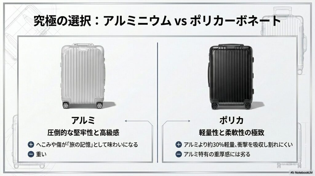 リモワ選びで最大の悩みどころが、伝統のアルミニウムを選ぶか、実用的なポリカーボネートを選ぶかという点です。それぞれのメリットとデメリットを把握し、自分の旅のスタイルに合わせて選ぶことが大切です。
