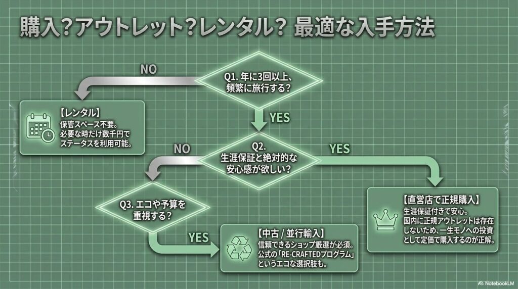 リモワのスーツケースのアウトレット店舗がないことは前述しましたが、直営店以外でも賢く入手する方法や、購入前に試す方法は存在します。