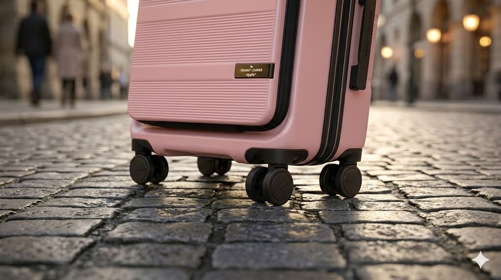 スーツケースの寿命を左右するのは、ボディの頑丈さ以上に「キャスターの性能」です。トランジットラウンジの多くのモデルでは、360度回転するダブルキャスターが採用されています。